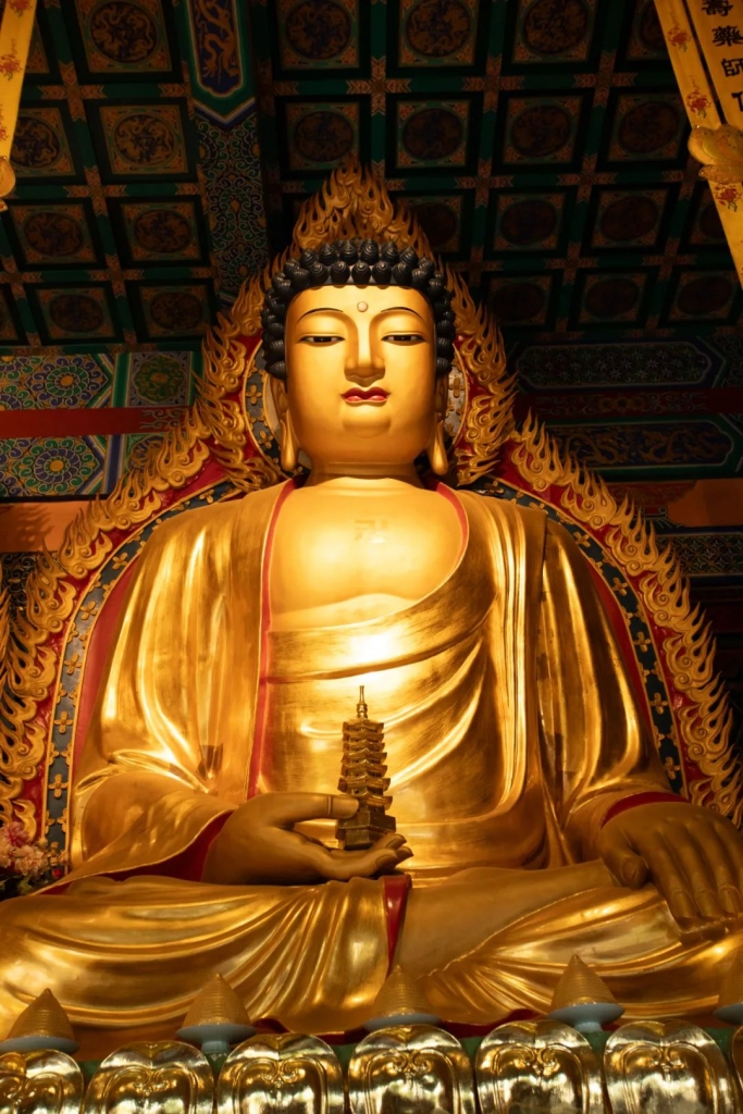 药师佛全称为药师琉璃光如来,又称大医王、医王善逝或消灾延寿药师佛,为东方琉璃净土的教主。左手执持药钵,右手结三界印,身着宝佛衣,结跏趺坐于莲花宝台,有十二神将。