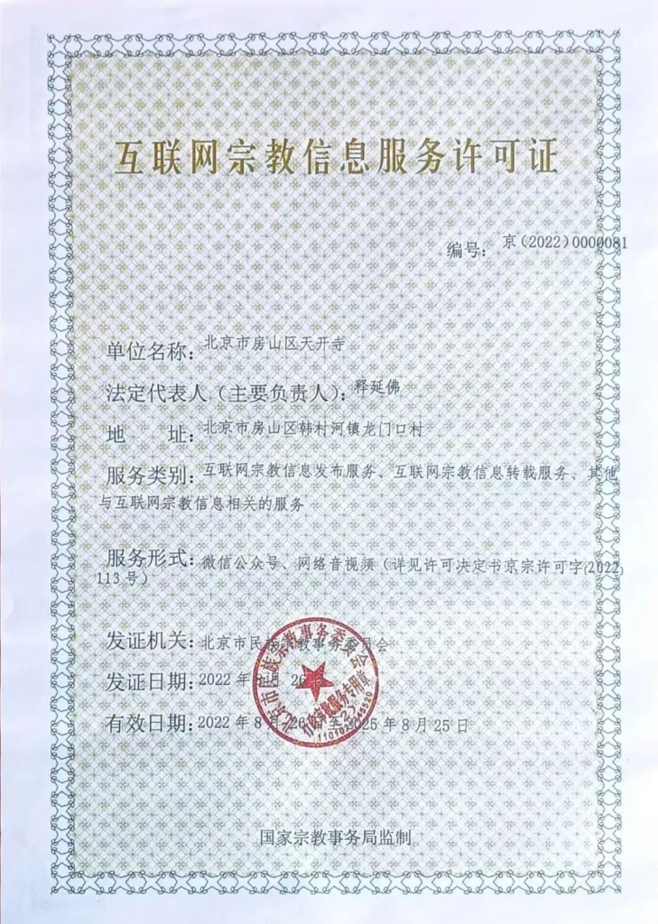 1、天开寺(微信号:tks1959,互联网宗教信息服务许可证编号:京(2022)0000081);