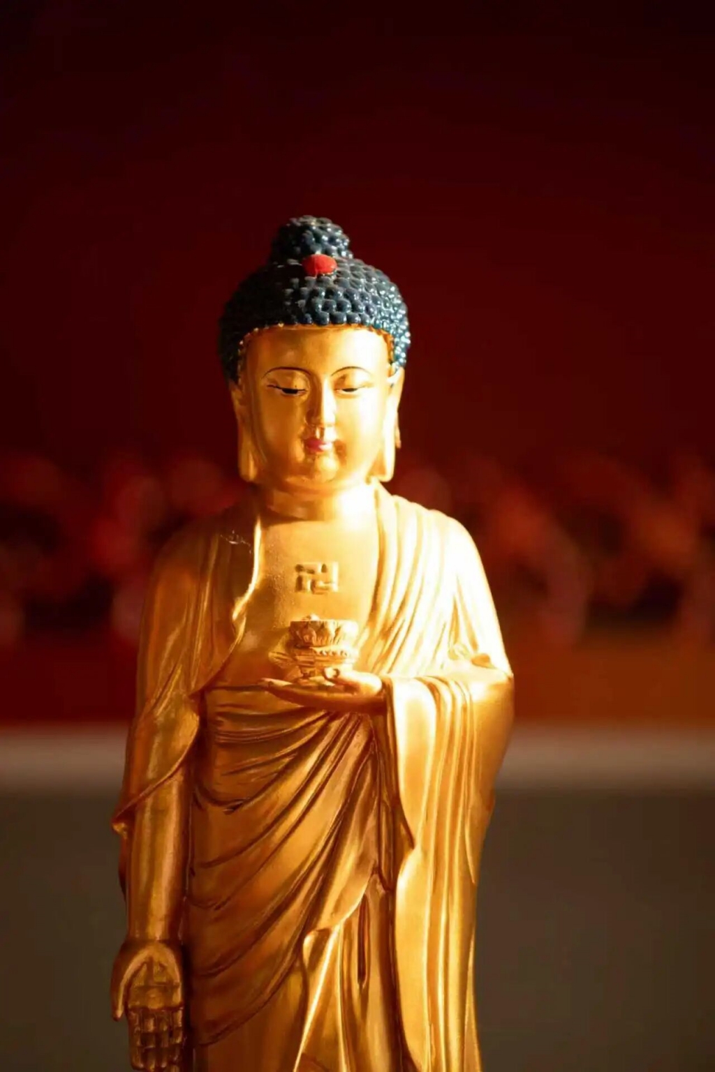阿弥陀佛,梵语Amitābha,略称弥陀,意为无量光、无量寿,故称阿弥陀佛,又称无量寿佛,无量光佛。阿弥陀佛是西方极乐世界的教主,观音菩萨、大势至菩萨为其左右胁侍,合称“西方三圣”。