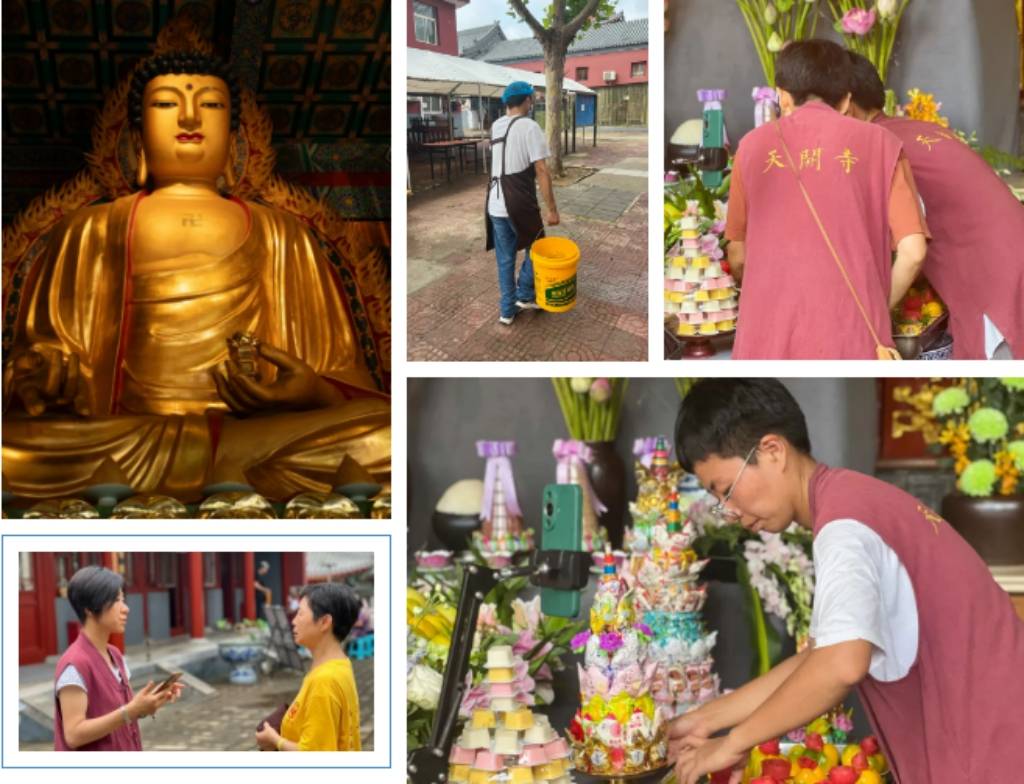 北京天开寺前院盂兰盆法会期间,默默奉献的义工菩萨们如同璀璨星辰,照亮了寺院的每一个角落。他们以虔诚之心,不辞辛劳,护持着寺院的庄严与清净,用实际行动诠释了慈悲与奉献的真谛。