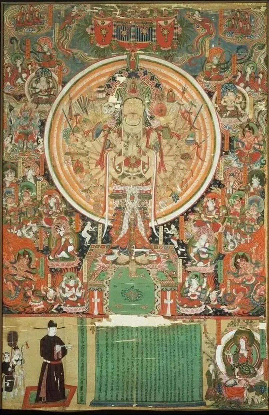 这是一幅极其精美、描绘细致、色彩鲜艳的九世纪晚唐绢画,出自敦煌莫高窟第17窟。图中央大圆光中,主尊千手千眼观音菩萨结跏趺坐于精美莲座之上,顶有华盖,头光由尖形光芒重叠组成,外圈为蓝色火焰纹。