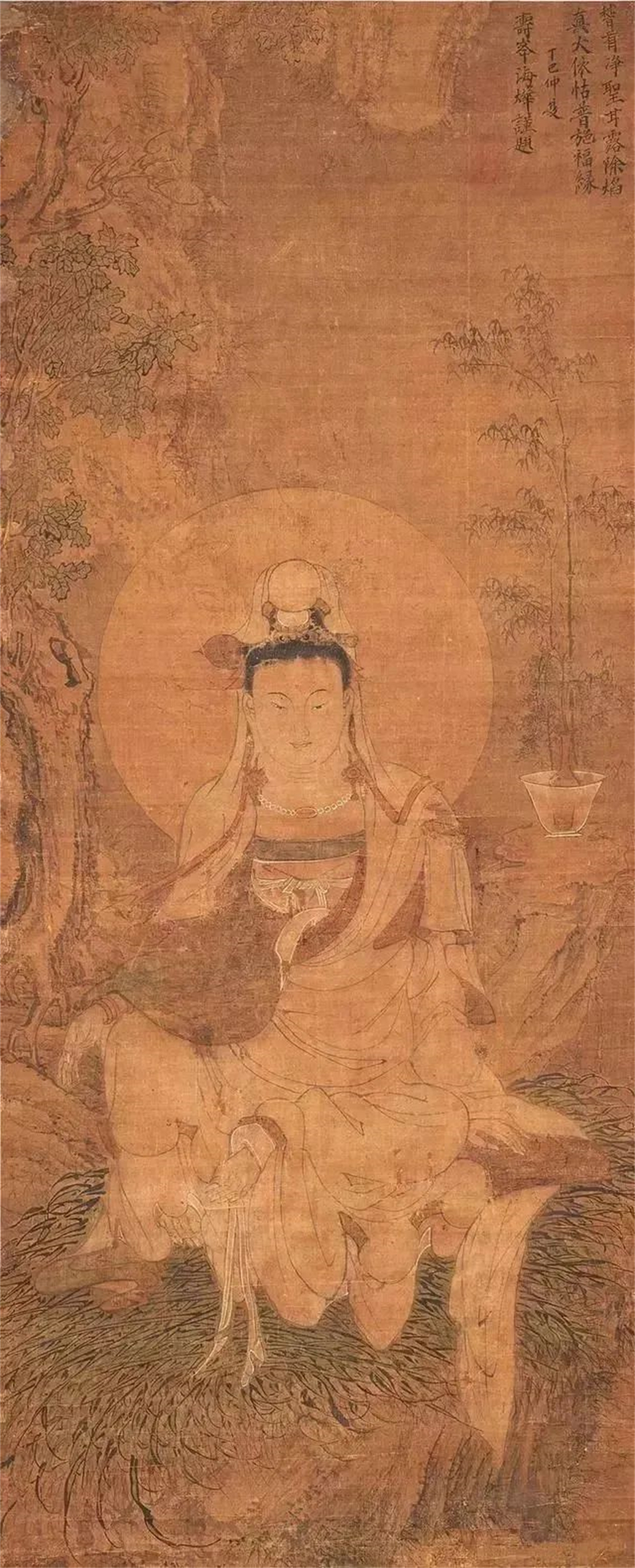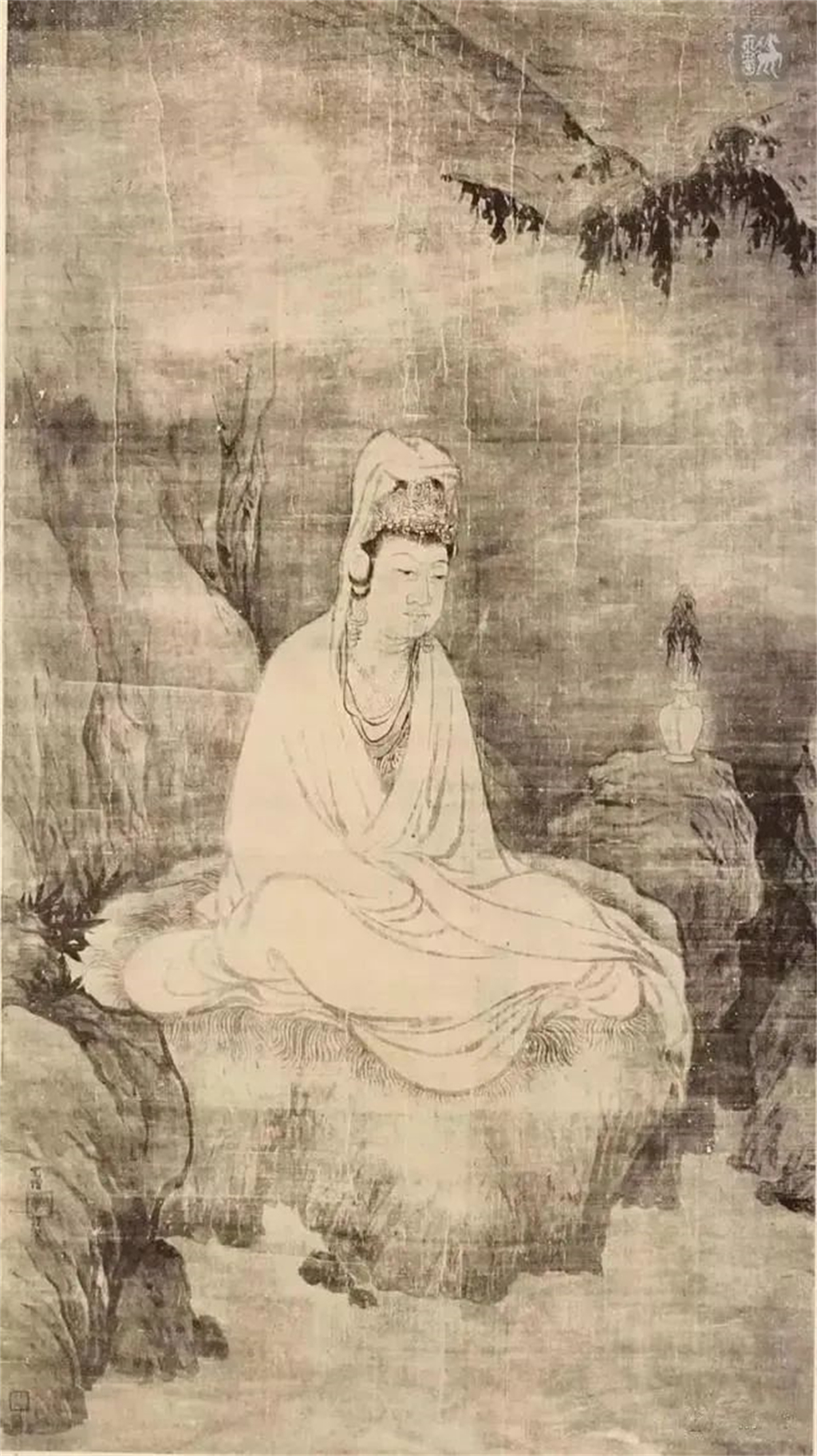 此图中的主角,曾被日本美术史家矢代幸雄誉为“幽婉的梦幻般的白衣观音”,端坐于溪边的岩石上,神态端庄,作冥思状。观音慈眉善目,表情安详,令人肃然起敬。