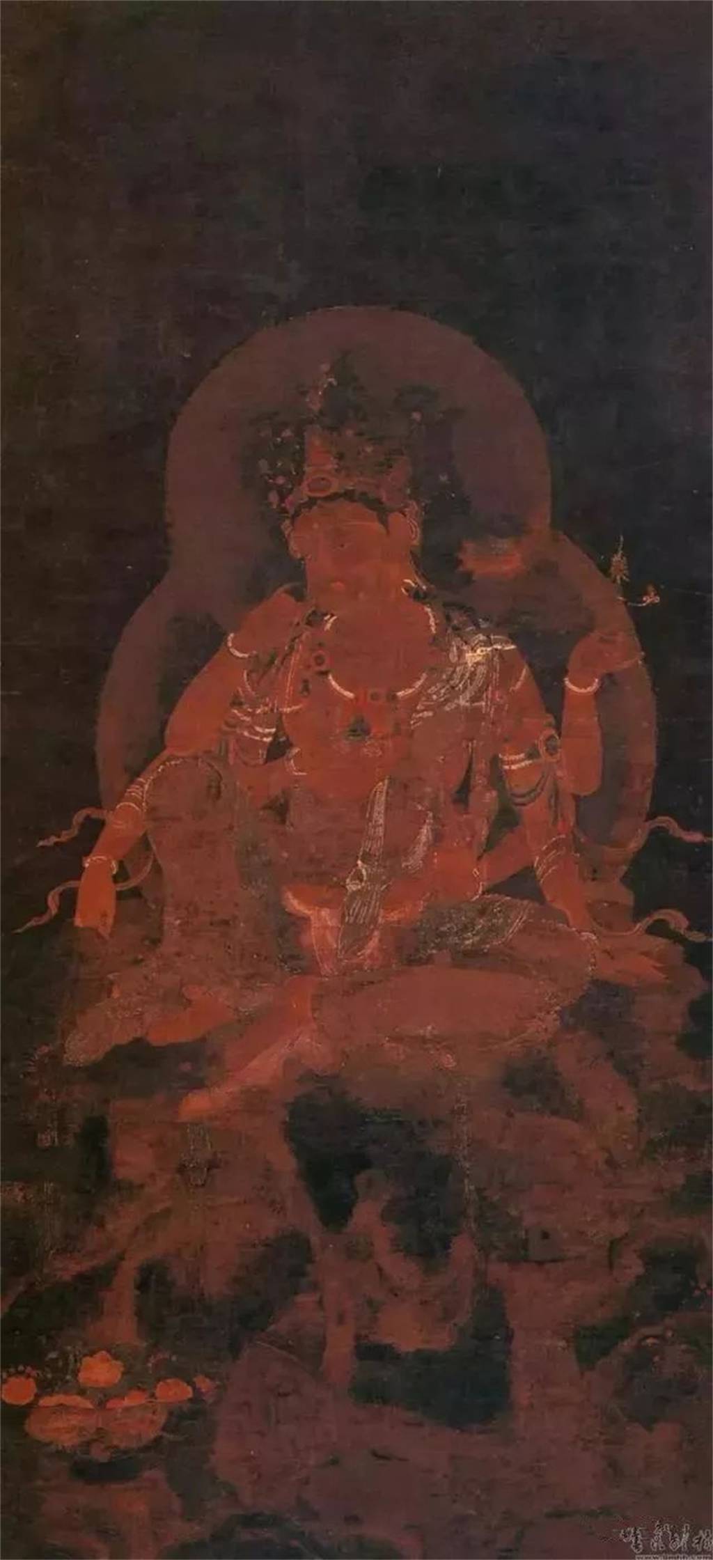 画面中春蚕吐丝般紧劲铁线所表现出的高超造型技巧令人叹为观止:菩萨那华腴丰满的肌体、婀娜多姿的体态、烂漫如花的手姿、当风飘举的吴带、玲珑剔透的头光以及浓淡相宜的敷色,皆令观者目炫神迷。