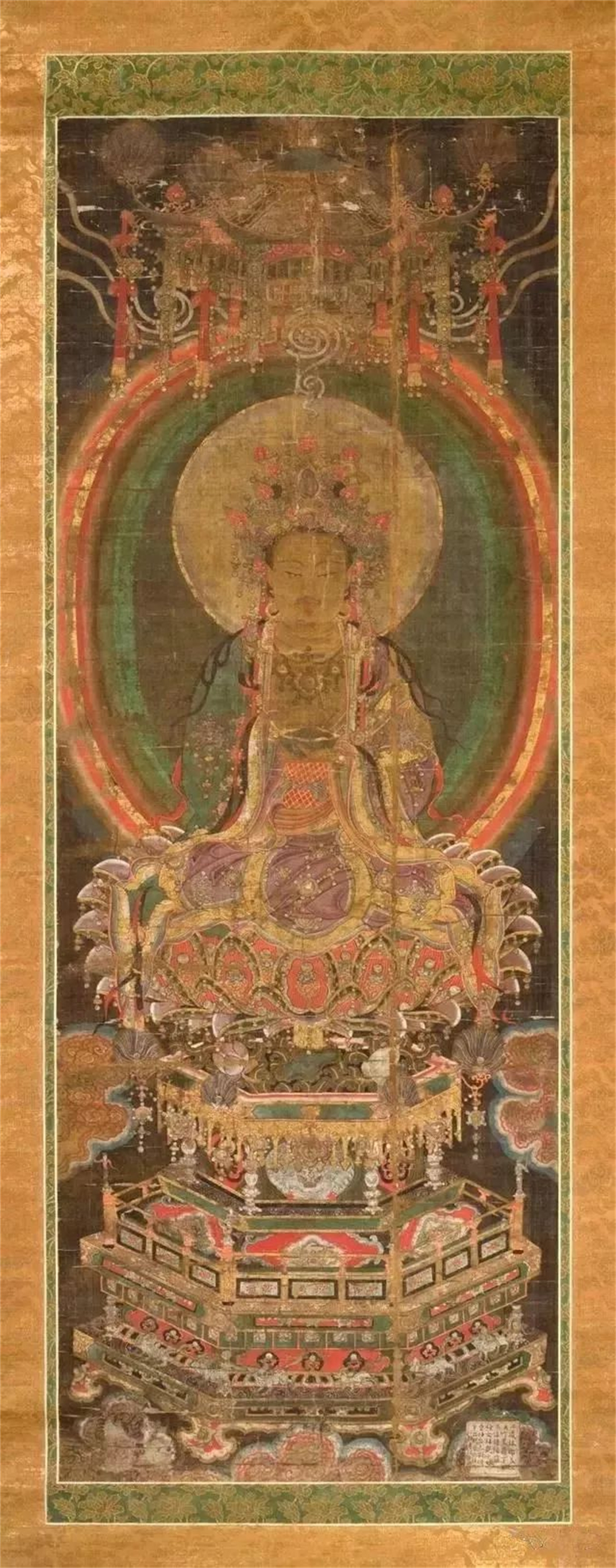 这幅明代大型绢画,尺寸硕大,绘制精细至极。以稀有珍贵的植物及矿物颜料绘制而成,并施以金粉,色彩富丽沉稳,烘托出观世音菩萨栩栩如生的神态与神圣的神韵,生意盎然。