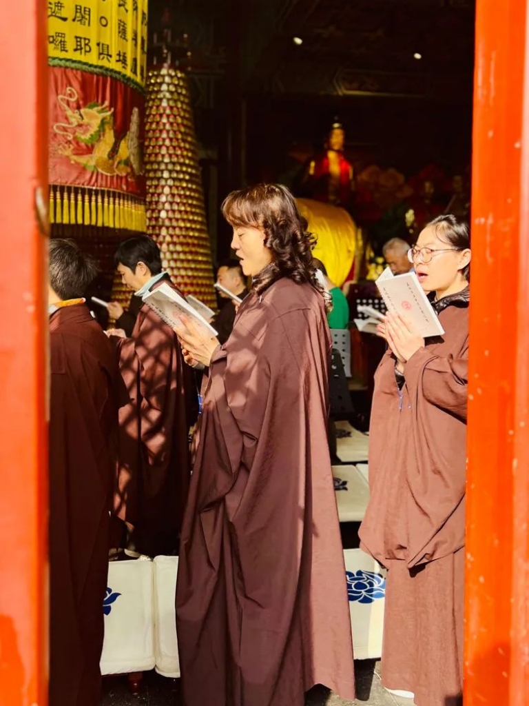殿内香云馥郁,宝偈高吟,合寺僧众齐聚殿内,道场庄严肃穆,如法如理。法会现场梵呗悠扬,大众摄身守意,礼拜诸佛,虔诚诵经。祈愿大众善愿皆成,国家繁荣昌盛,人民幸福安康!
