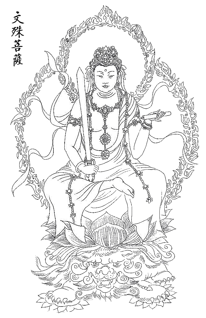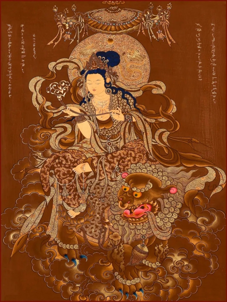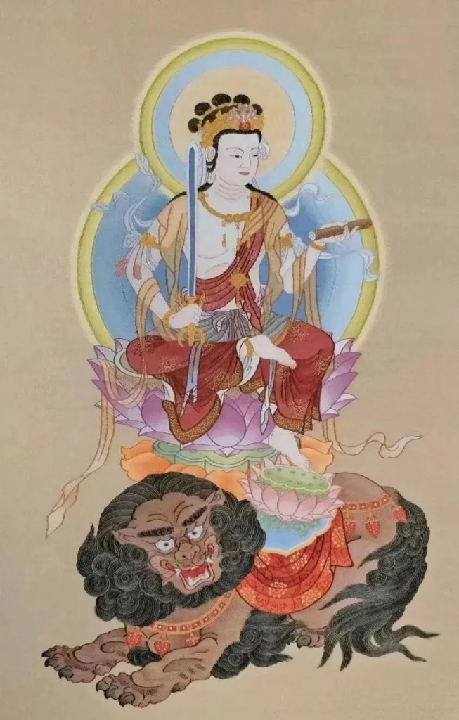 文殊菩萨的形象,通常是手持慧剑,骑乘狮子比喻以智慧利剑斩断烦恼,以狮吼威风震慑魔怨。仗剑骑狮之像,代表着其法门的锐利,以右手执金刚宝剑,断一切众生的烦恼,以无畏的狮子吼震醒沉迷的众生。