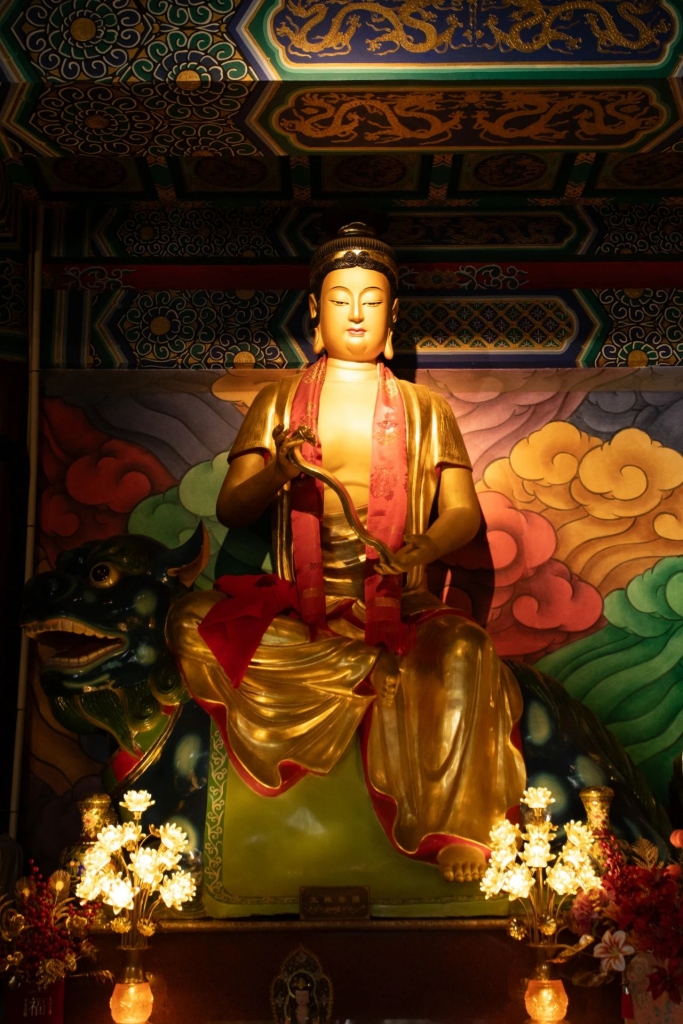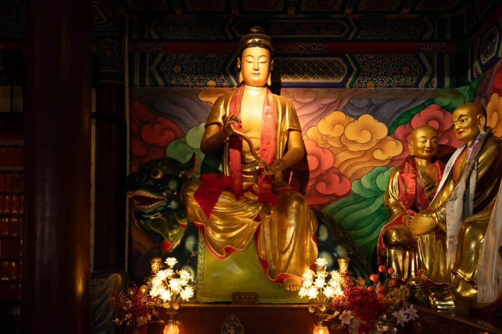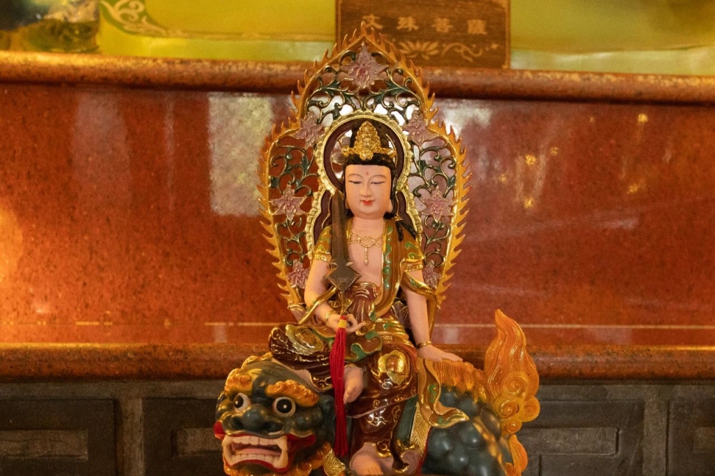 在佛教中,文殊菩萨是智慧的化身,与普贤菩萨同为释迦牟尼佛的左右胁侍,并称“华严三圣”。