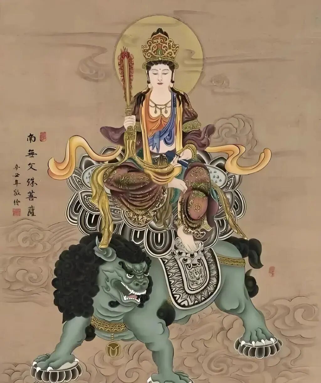 文殊菩萨的形象,通常是手持慧剑,骑乘狮子比喻以智慧利剑斩断烦恼,以狮吼威风震慑魔怨。仗剑骑狮之像,代表着其法门的锐利,以右手执金刚宝剑,断一切众生的烦恼,以无畏的狮子吼震醒沉迷的众生,这是文殊菩萨的基本形象。