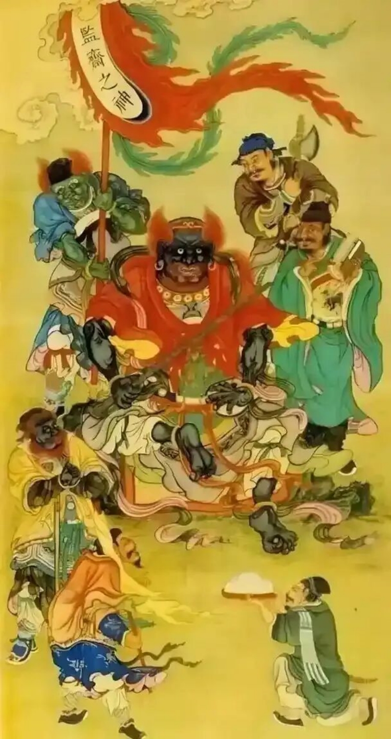 监斋菩萨常现三头六臂之相,赤面虬髯,手持各类炊具法器,将日常炊事升华为修行道场,彰显在平凡劳作中实践佛法的智慧。寺院斋堂多悬“未供先尝三铁棒,私造饮食九铜锤”之联,以此警示僧众:用斋饮食之间,亦须不忘修行;行住坐卧之中,皆可体悟禅心。
