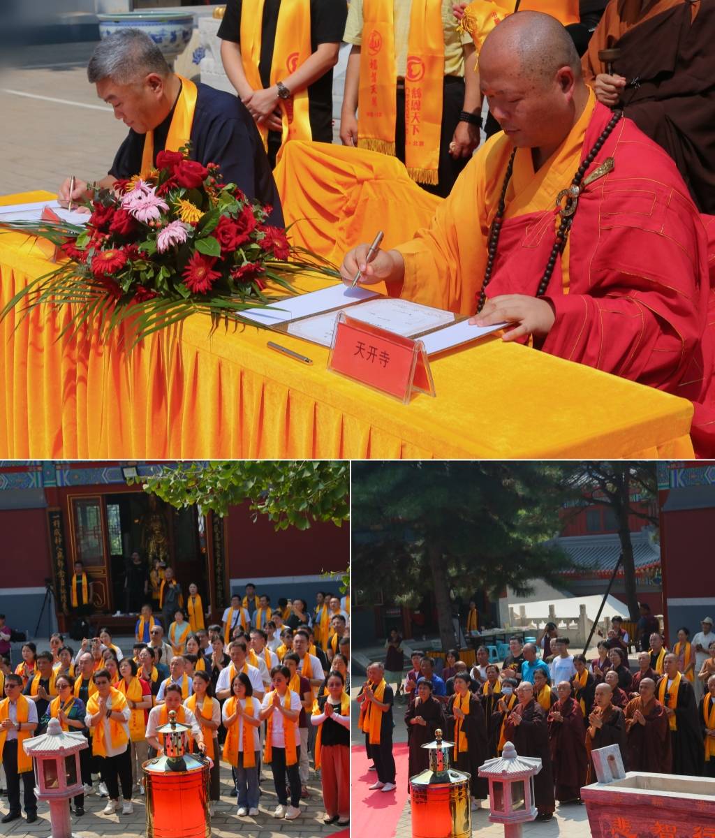 盛大的签约仪式由北京天开寺院方主办、北京慈恩天下网络技术有限公司协办,天开寺众法师、居士及志愿者应邀出席,慈恩天下郭勇虎总经理携全国分支机构代表及北京员工共百余人到场观礼。